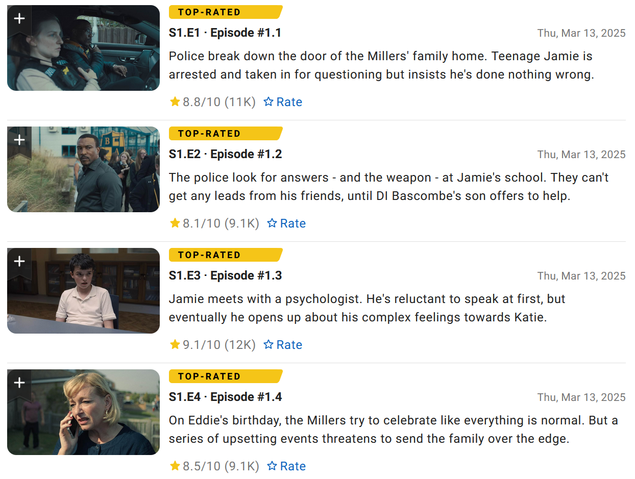 However, Adolescence can also be fairly described as shallow and deeply flawed. I will briefly summarize the series, including my own “ratings”, episode by episode. It should be a decent refresher if you have already seen the show. And if you haven’t and aren’t allergic to spoilers, you will at least get some vague impressions of what it’s all about. I will not, however, pretend that every part of the review will make perfect sense without the full context of the TV show..