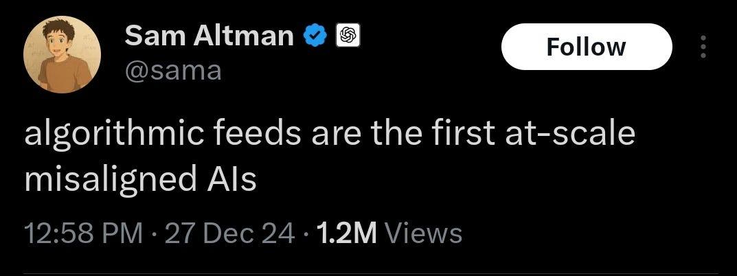 Bo Burnham’s trajectory is unique, but his starting point was not--he was just one of the early ones. In 2006, when social media was still young and promising, anyone with an Internet connection could hypothetically step onto the same massive stage. You, the 2006 Time Person of the Year, could share anything you wanted with an audience of more people than you would ever get in real life, and they with you. You could engage with their posts, or they with yours, with little hearts or thumbs-ups or comments. This engagement became the metric by which the social media platforms grew users and revenue--more engagement meant more usage and more exposure to ads--so they updated their functionality over time to obtain more and more of it from users. Thus “the Algorithm” was born, with this core drive of maximizing your engagement, curating your feeds with only the content that you find the most engaging. The UI was updated, too: no more links or numbered pages to flip through, just one never-ending scroll of embedded media, minimizing the muscle movements required to see the next thing. Over the years, social media has become less interpersonal and more spectacular, in this attention-maximizing pursuit--It isn’t even really ‘social’ media anymore.