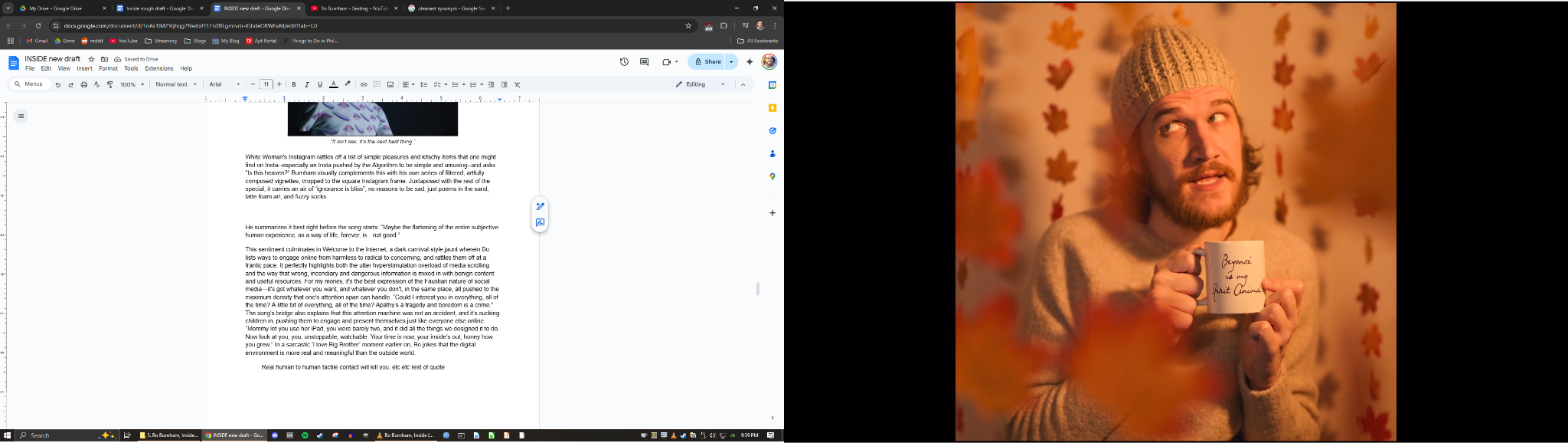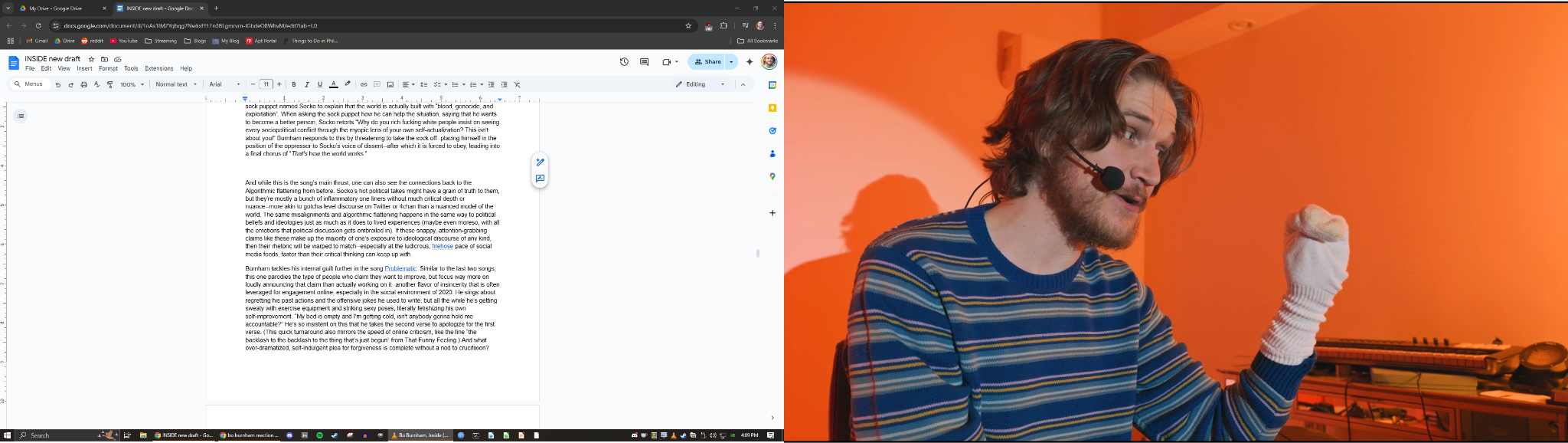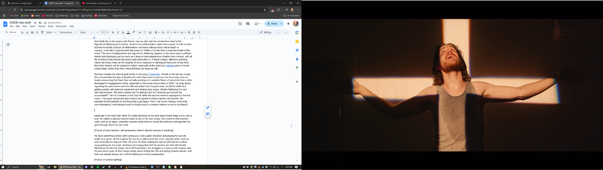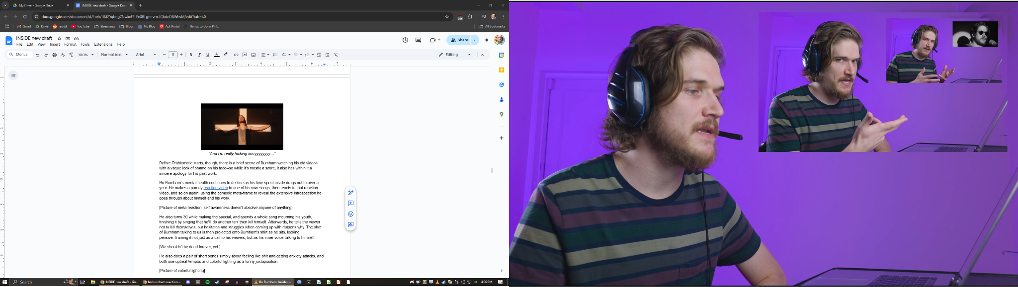 That disgusted, half-outside perspective grows to become a central aspect of Burnham’s material moving forward. A few years later, Burnham returns with a live special called what. that airs for free on YouTube, and it's a dramatic uptick in quality. For this special he takes control of the whole format of stage performance and plays with it, constantly interacting with voiceovers of himself and prerecorded bits, and “performing” pre-composed songs with carefully timed movements and choreography. His style is unabashedly postmodern, constantly setting up some trope or situation and then immediately subverting it or throwing it away, and then showing the audience “look, this was all a setup, nothing is real”. The subversions are both funny in themselves (humor comes from the unexpected), but also clearly hold that core sentiment of inauthenticity in performance that first pushed him to make “Art Is Dead”. In an interview around this time, Burnham says about his fans “I try to emphasize, ‘I am nothing but my content to you’”. Burnham doesn't just reserve this sentiment for himself, either; he also points it toward other types of entertainers who profit from maintaining the parasocial kayfabe. He lambasts vapid pop singers for preying on vulnerable teens, and calls out other comedians for using tragedy as joke fodder. In a similar vein, he also criticizes pointless and harmful religious morals by singing from God's perspective and correcting them--very en vogue at a time when /r/atheism was still on reddit’s homepage.The general attitude is “Nothing up here is authentic, but at least I have the decency to tell you—not like these other people who want to take advantage of your emotions by acting genuine.”