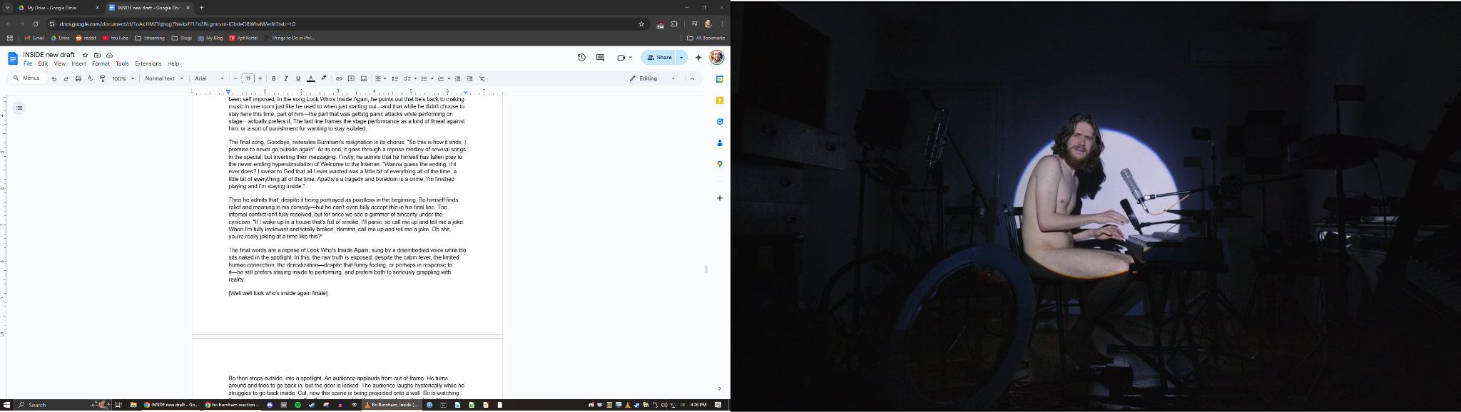 The final words are a reprise of Look Who's Inside Again, sung by a disembodied voice while Burnham sits naked in the spotlight. In this, the raw truth is exposed: despite the cabin fever, the limited human connection, the derealization—despite that funny feeling, or perhaps in response to it—he still prefers staying inside to performing, and prefers both to seriously grappling with reality.