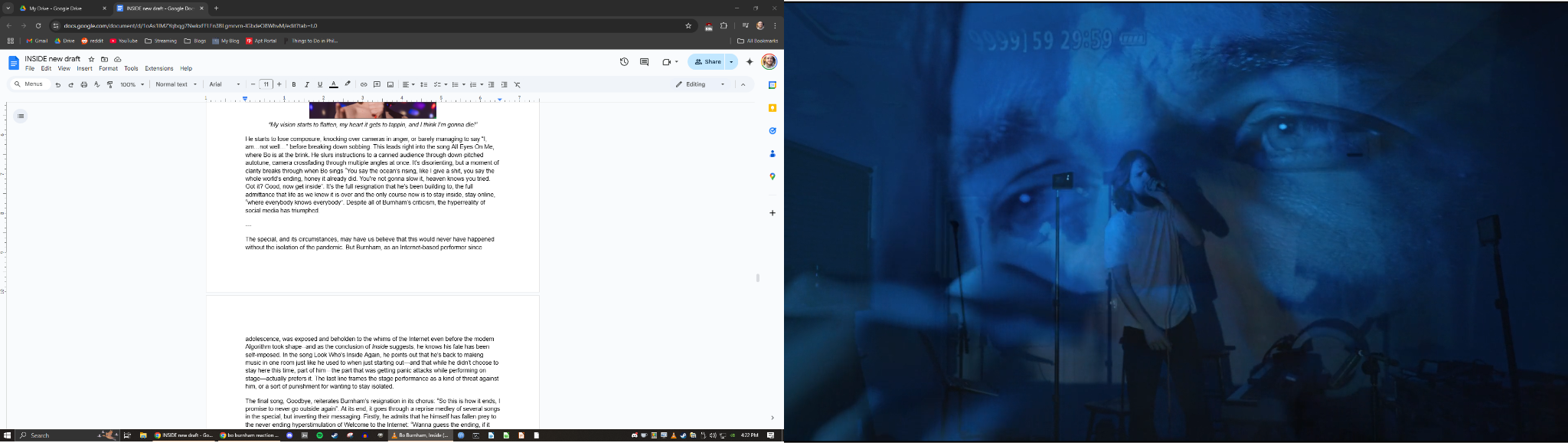 The special, and its surrounding circumstances, may have us believe that this would never have happened without the isolation of the pandemic. But Burnham, as an Internet-based performer since adolescence, was exposed and beholden to the whims of the Internet even before the modem Algorithm took shape--and as the conclusion of Inside suggests, he knows his fate has been self-imposed. In the song Look Who's Inside Again, he points out that he's back to making music in one room just like he used to when just starting out—and that while he didn't choose to stay here this time, part of him—the part that was getting panic attacks while performing on stage—actually prefers it. The last line frames the stage performance as a kind of threat against him, or a sort of punishment for wanting to stay isolated.