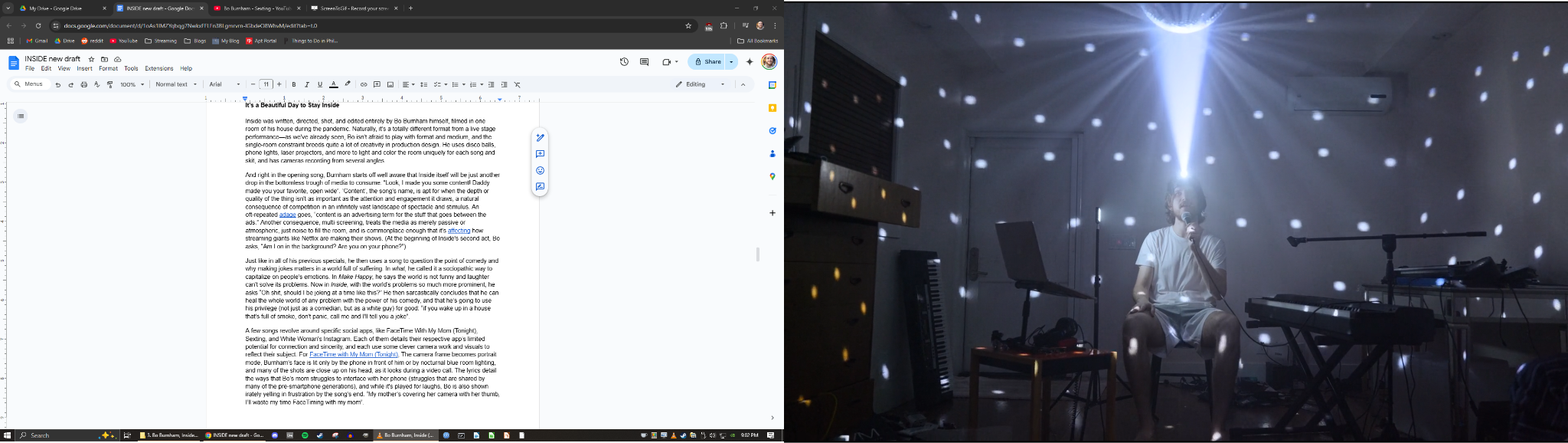 Inside was written, directed, shot, and edited entirely by Bo Burnham himself, filmed in one room of his house during the pandemic. Naturally, it’s a totally different format from a live stage performance—as we've already seen, Bo isn't afraid to play with format and medium, and the single-room constraint breeds quite a lot of creativity in production design. He uses disco balls, phone lights, laser projectors, and more to light and color the room uniquely for each song and skit, and has cameras recording from several angles.