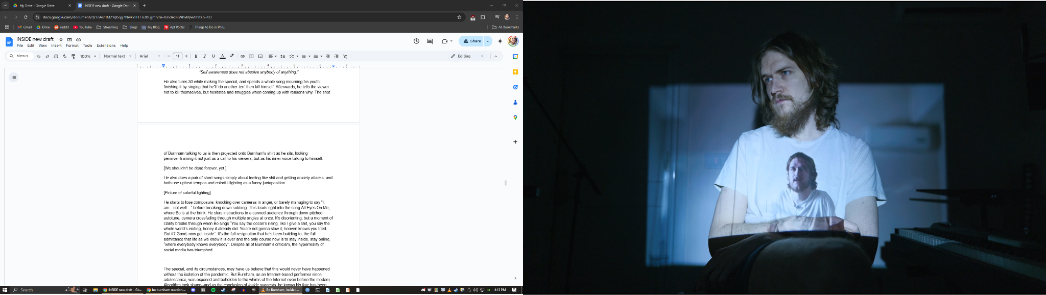I do not wish to condone Burnham’s cynicism by praising Inside. The Internet is still a wonderful boon for humanity, and social media is no small part of that. There are at least just as many ways to engage online healthily and honestly--like, say, writing a long-form media review for a blog--as there are to get addicted or manipulated by algorithmic feeds. With every passing year we cultivate a better understanding of the detriments to social media, encourage its use in moderation, and build up our cognitive immune systems to better withstand engagement bait. The story of Bo Burnham’s career is a cautionary tale of what can happen without these defenses, and Inside is its capstone. It isn’t perfectly timeless--its wokeness and anti-capitalist slant already feel rather dated and cringe (though they do serve as a good time capsule of the vibes in 2020)--but barring that, it still stands today as a comprehensive illustration of the social challenges of this digital era, and a master proof of creativity from constraint. Give it a watch yourself sometime soon to see if you agree--just remember afterwards to get some sun and touch some grass outside.