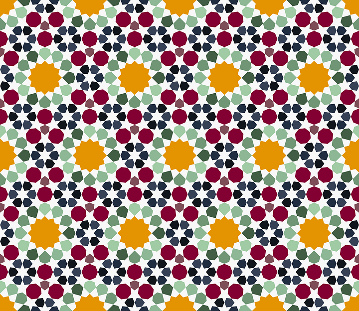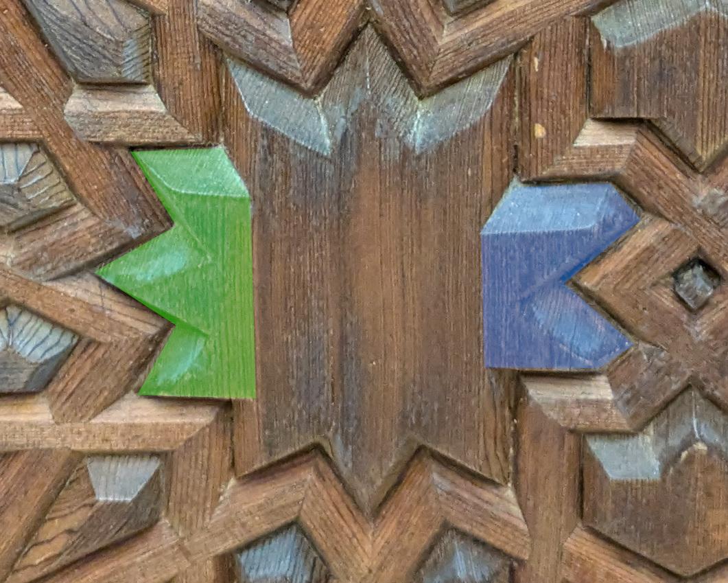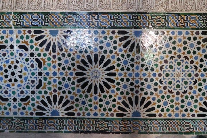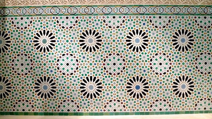 Even at the pictorial level, choices must be made about how to develop the lines. The pattern lines might be thickened, interlaced, or erased and relegated to the background to serve as borders of mini-tiles. The choice of color and material plays a crucial role in shaping the character of a piece: it dictates how the patterns are rendered and reflects regional tastes. For example, simple wood panels often favor interlaced patterns, since intersections accentuated by carved wood trims can generate visual interest through contrasting profiles, even in absence of vibrant colors. Among the examples discussed above, _jali_s are typically Indian, while zellij is quintessentially Andalusian-Moroccan. Additionally, many geometric designs are augmented by other forms of ornamentation, such as calligraphy and arabesque. So I want to acknowledge that the actual practice of Islamic decorative arts is much more complex than I’ve suggested so far, and I certainly don’t mean to belittle the craft of the artists who built the Moroccan court.