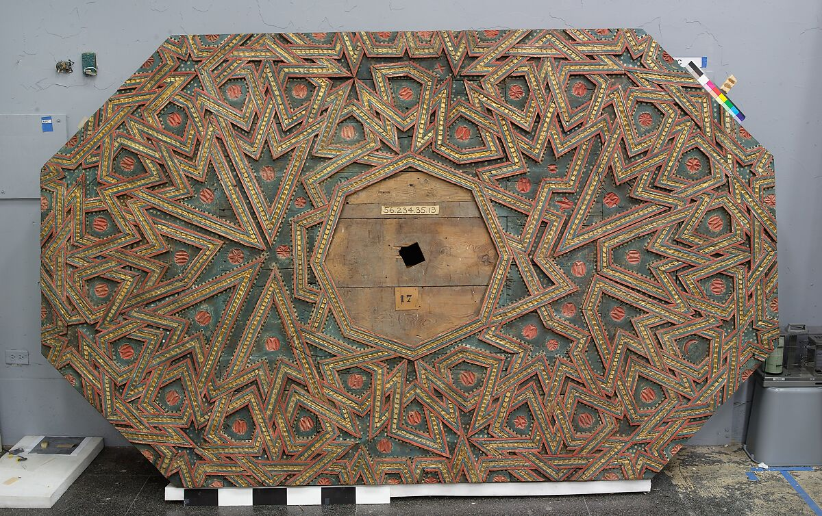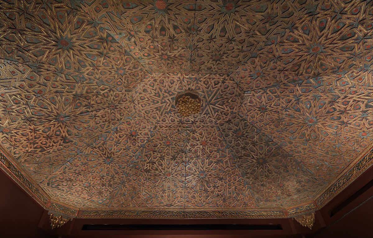This ceiling has an interesting provenance. It dates to 16th century Spain. The Met describes it “a testament to the resilience and persistence of traditional Islamic design in Andalusia after the Christian Reconquista”. Its “somewhat uneven geometric pattern” is explained as the result of an adaptation from a smaller piece designed for a smaller and more symmetric space, so compromises had to be made.