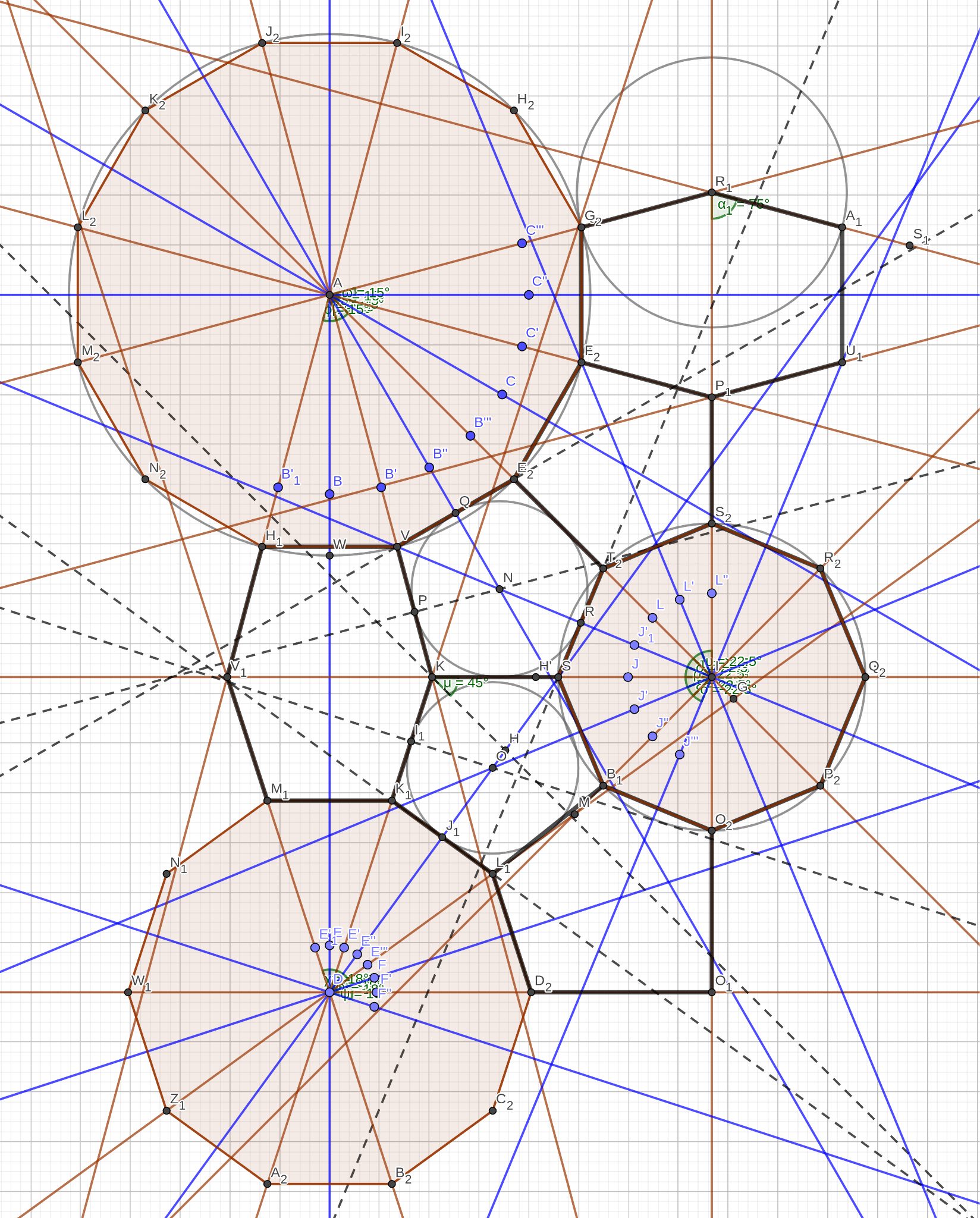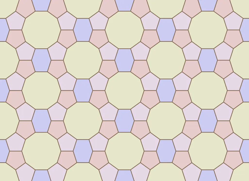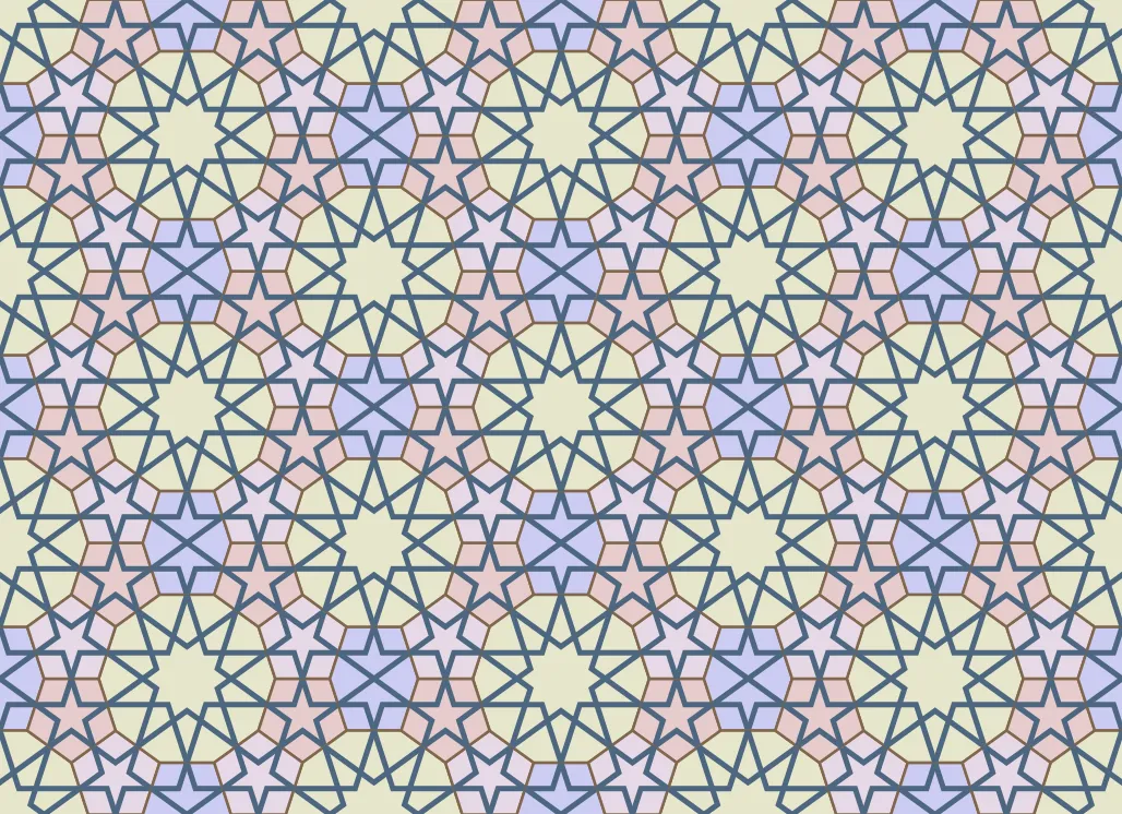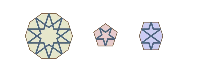 While the process described so far may seem systematic and rigid, there are also non-systematic aspects that greatly increase the variety. For example, observant readers may have noticed that the pattern lines in the decagonal tile don’t strictly follow from the method described so far. To achieve the nested star shape, the pattern lines emanating from the edges are extended until they intersect with a second line. This adjustment enhances visual appeal in the largest and most prominent tile in the design. It also balances the density of pattern lines, preventing a large open space from appearing in the center of the decagons.