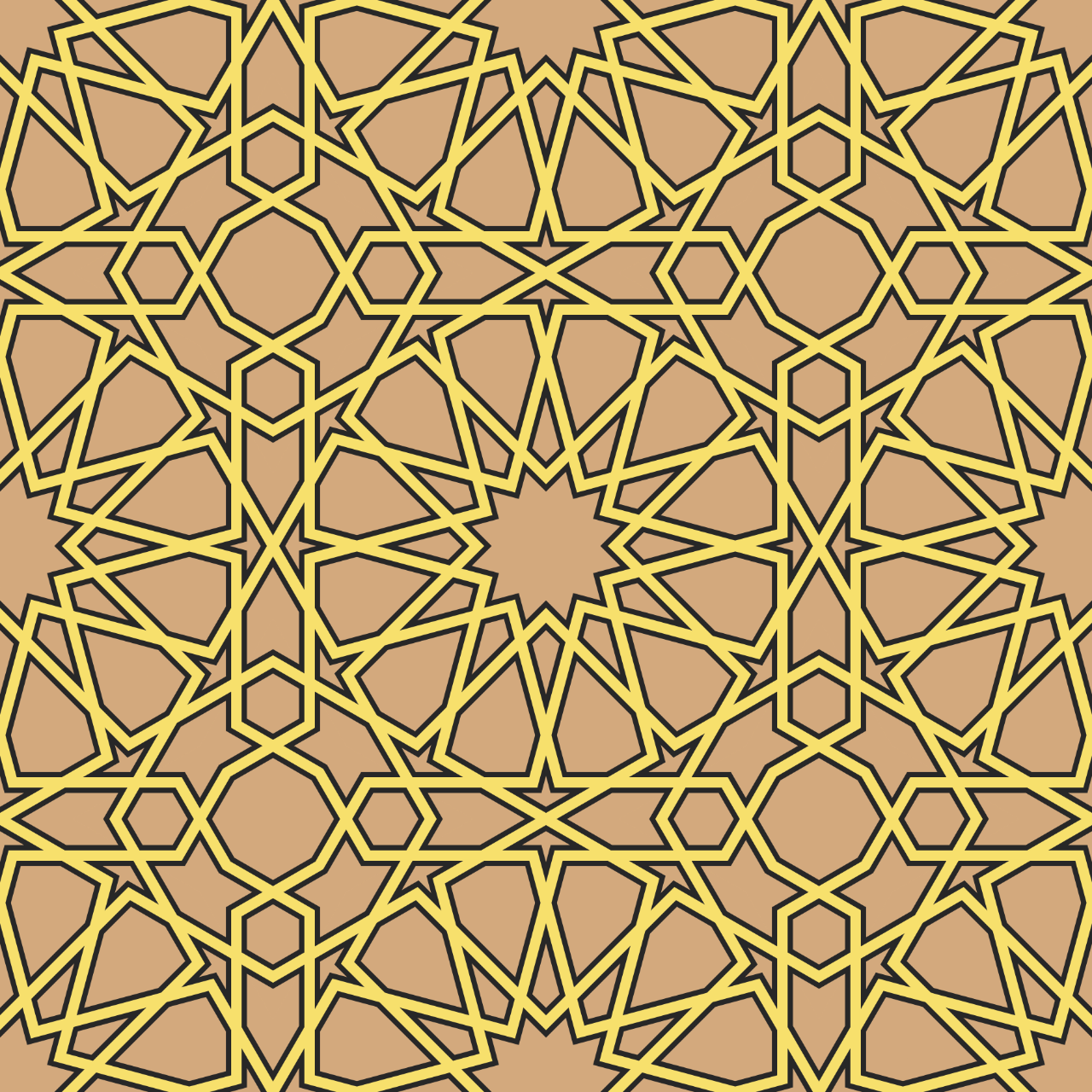This pattern is based on one set of polygonal tiles and a specific arrangement of them. There are many families of such tiles based on regular polygons, helpfully classified by Jay Bonner and Craig Kaplan in their tome Islamic Geometric Patterns according to the order of rotational symmetry of the largest regular polygon in the set. Additionally, there are numerous ways to fill the plane with these tiles (some examples of regular polygonal tilings can be found here). Given a set of polygonal tiles, various — though not arbitrary — seed angles can be chosen. The choices of tiling and seed angles have the strongest influence on the resulting pattern. An experienced artist can intuitively select the appropriate tiling scheme and seed angle to suit their intentions without needing to plot out the entire design.