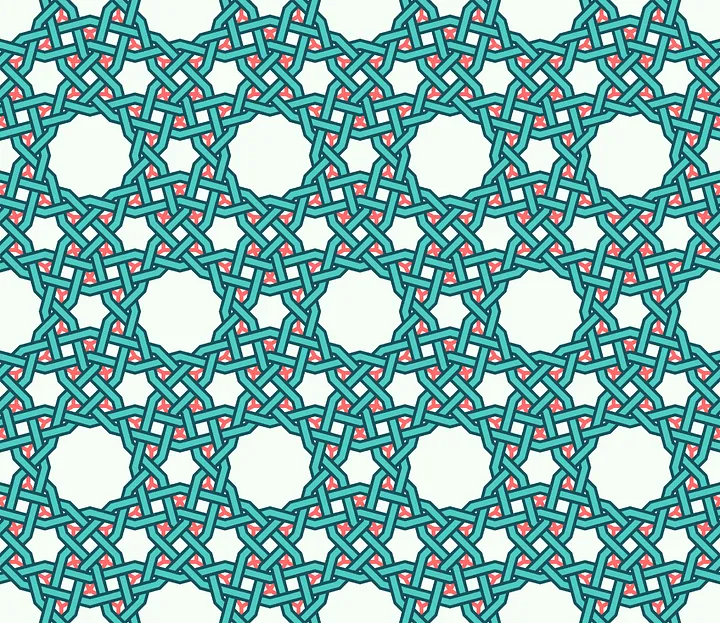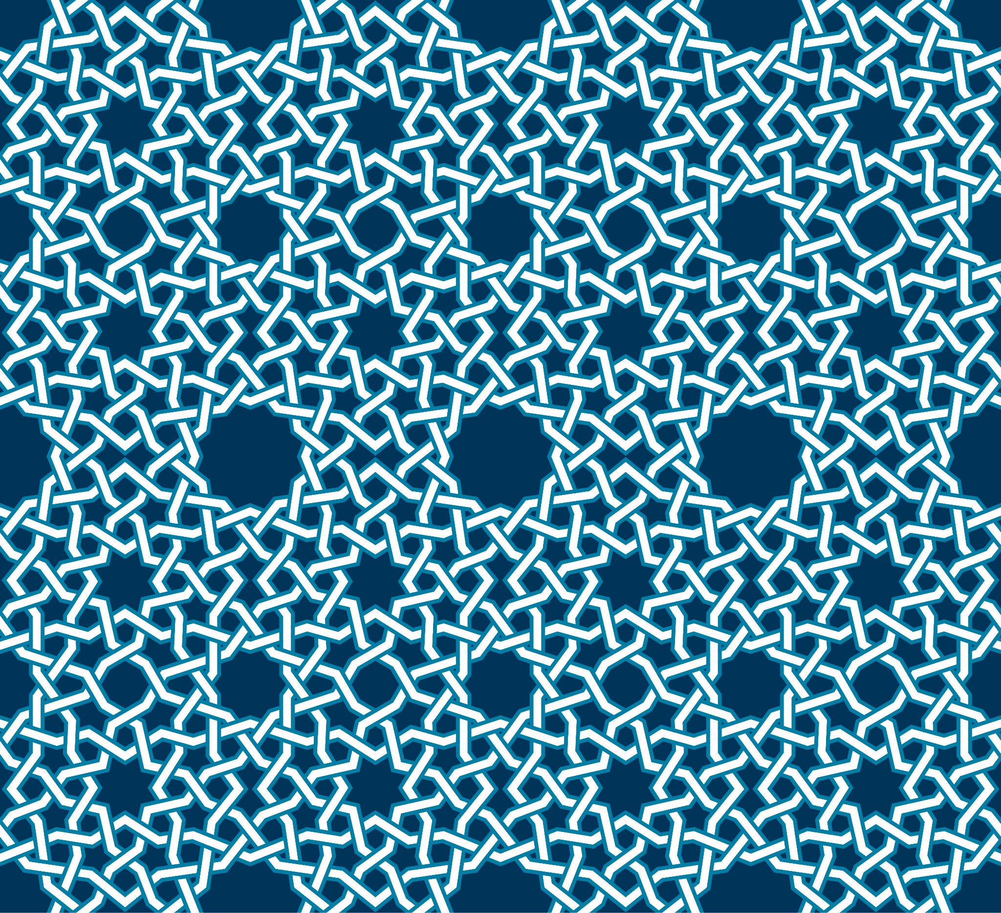 That said, Islamic geometric patterns as a genre are quite distinguishable from other decorative traditions. These designs incorporate, or at least imply, both translational symmetry (such that a section of the design can be repeated to fill the plane) and point symmetries (exhibited by complex star- or flower-like patterns clustered around various foci). They feature interlocking or interlacing lines that suggest an infinitely continuing weave, as if executed by a meticulous yet imaginative artisan who knows precisely where to bend and twist the threads to surprise you at every turn.