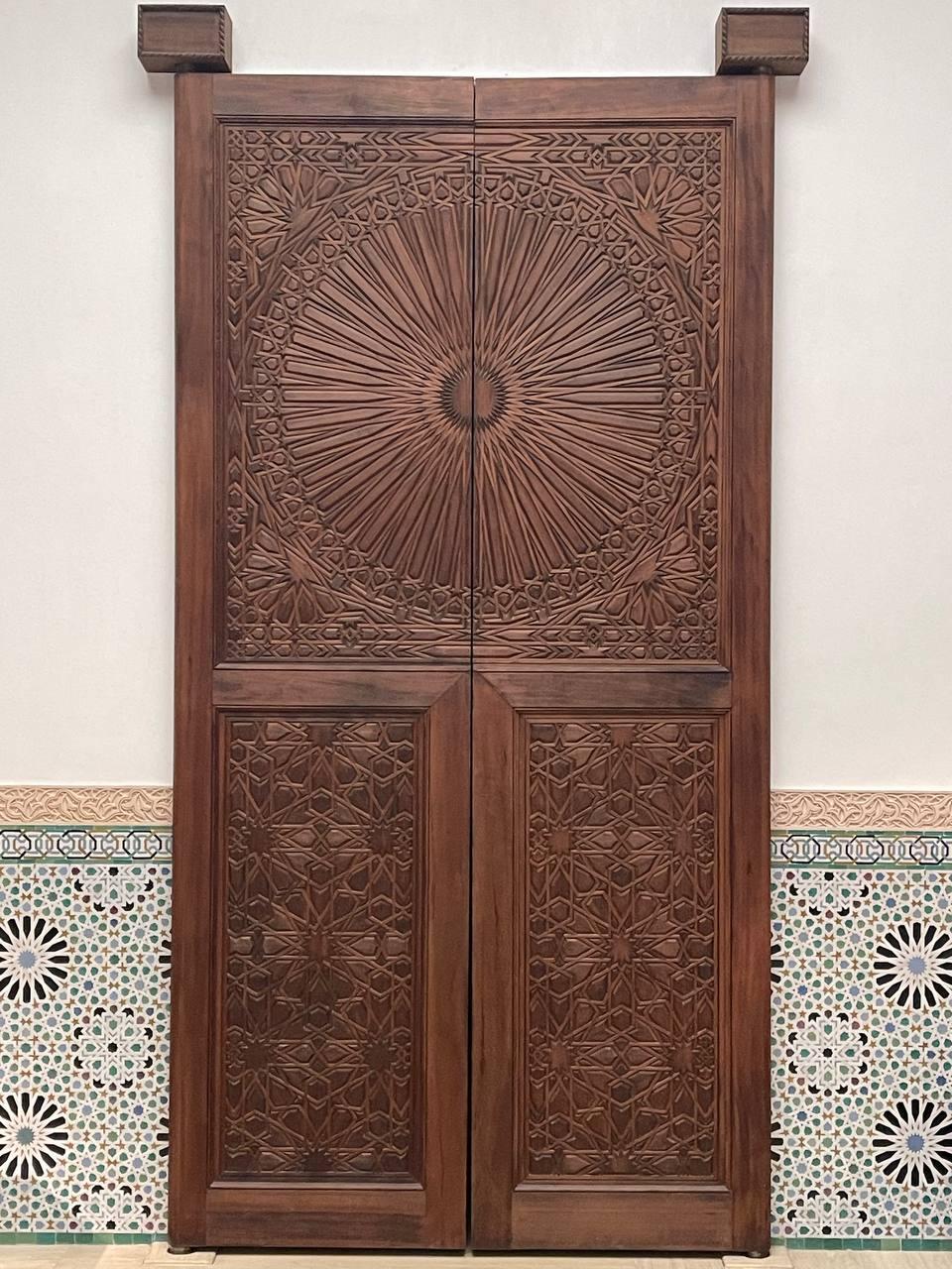 At the center of one wall stands a set of large wooden double doors, perhaps inspired by the entrance to a study in a madrasa in Fez. Being in an art museum, you wouldn’t attempt to open them, knowing better than to touch the artwork. But it is clear in any case that these doors don’t lead anywhere, and at that moment, you see through the illusion. You probably won’t even notice the flaw in the geometric pattern on the doors, but I think it hints at why the illusion ultimately falls short.
