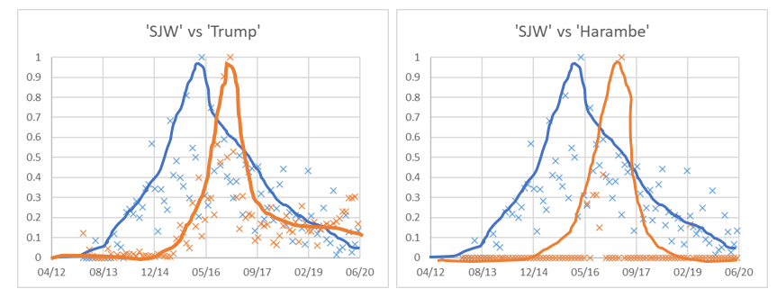 The evidence for this hypothesis is kind of mixed – if you abandon all sense of statistical appropriateness you can freehand draw a line which kind of looks like the decline in ‘SJW’ tokens is mirrored by a rise in ‘Trump’ tokens when you normalise the two terms, but you can also do that with any other word that was trending in April 2016, like ‘Snowden’ or ‘Wikileaks’ (or ‘Harambe’ as per the graph below). Looking just at the data it isn’t really a very impressive correlation to draw.