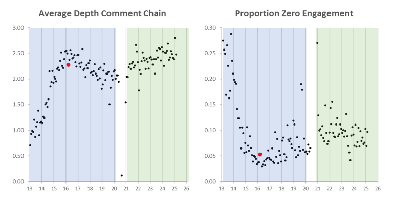 Depth of engagement matters for several reasons, but the most important is simply that it shows people are getting enough out of a discussion to keep participating - a strong marker of a high-quality Commentariat. This is especially relevant in the ACX context, where many commentors don’t fit neatly into predefined categories like ‘Democrat’ or ‘Republican.’ As a result, discussions often require more time to clarify positions and establish common ground before real debate can begin. In that sense, depth also serves as a proxy for the number of interesting and non-standard voices present, which is itself a sign of a healthy and valuable comment section.