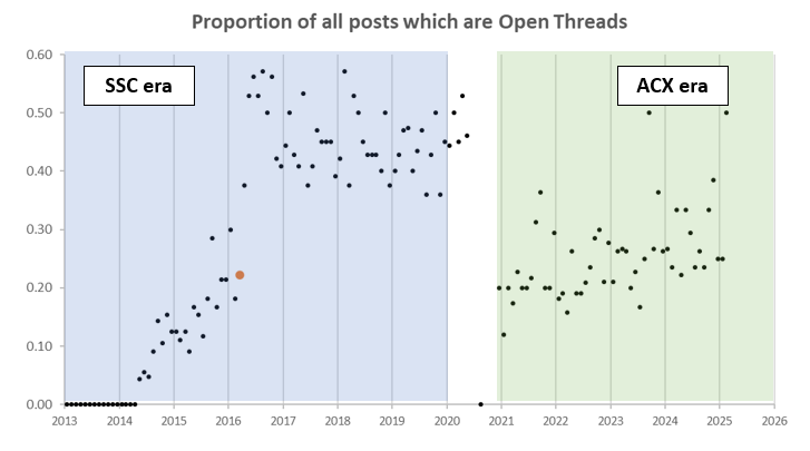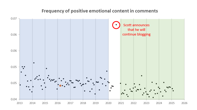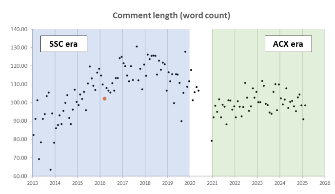 If true, this would be a very optimistic story to tell, because you don’t really see similar markers in 2024 when Trump II was elected, suggesting the Commentariat has worked out how to have mature discussions about Trump without swamping other topics they want to discuss. Similarly, Scott made no major changes to the comment section during that period, so it was able to adjust to post-Trump norms more naturally. Together, that suggests that the green shoots of improving comment quality we see in 2024 and early 2025 have no natural reason to reverse, and we could easily be seeing a Commentariat renaissance in progress.