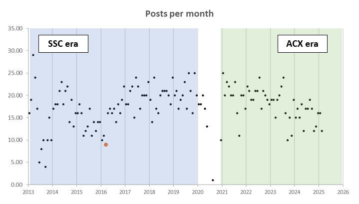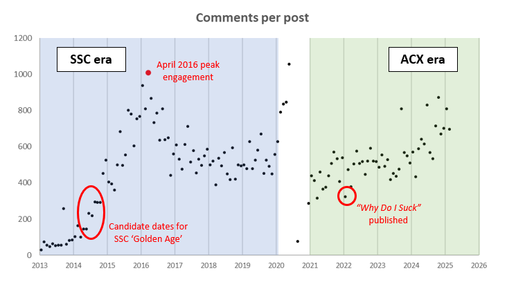 The ACX-era begins in 2021 and is highlighted in green. You can see engagement starts lower than the SSC steady-state of 400-600 comments per post (maybe more like 300-400 per post) but increases over time to at least that level by 2024, getting close to the peak engagement era. In one of life’s small ironies, Scott wrote Why Do I Suck? at close to the lowest period of engagement the blog had experienced for nearly a decade.