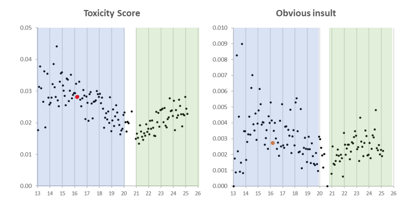 - Toxicity scores show a clear directional reversal in 2021 (but nothing in 2016)