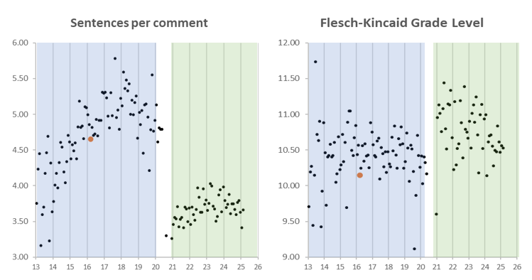 My conclusion here is that these data are completely consistent with a Commentariat who have a particular thing that they like, which peaked in 2017. This thing quantitively looks like long stale sentences, but actually might qualitatively feel different – like for example careful definitions of words which are then used repeatedly. As for why the peak sentence length is after peak engagement, my best guess is that people didn’t stop engaging at random; the people with the strongest commitment to the Commentariat stuck around longest, and these are also the people with the most respect for SSC cultural norms (leave long, thoughtful comments) and willingness to dedicate time to commenting. I have heard this described as ‘evaporative cooling’ before. This group of ‘fanatics’ hung around for a bit longer than everyone else, but eventually either they mostly left too or their influence on discussion norms was not strong enough to prevent a reversion towards the comment section mean (which tends towards shorter and less rigorous comments)