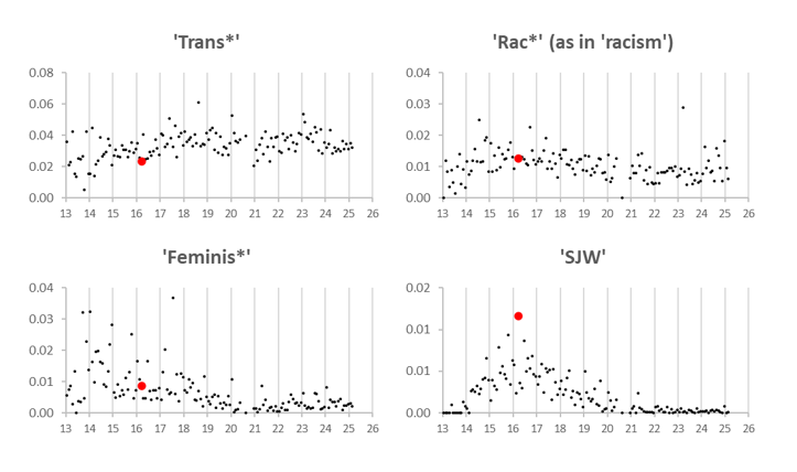 - Freedom of expression shows a scruffy directional reversal in 2016 and a clearer one in 2021, and also looking at individual kinds of expression reveals very sharp peaks in 2016 for ‘SJW’ and related phrases