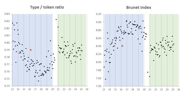 Third, I looked at sentence construction. The type-token ratio is a simple measure of vocabulary richness, calculated by dividing the number of unique words (types) by the total number of words (tokens) in a text. This measure has a very specific problem in the context of the Commentariat in that it becomes less useful as comments become longer (because the chance of repeating a word increases). Therefore, I’ve also used the ‘Brunet Index’, which I know nothing about but which Google tells me fixes this problem. The two measures have an inverse relationship to each other – type/token ratio measures lexical variety, Brunet Index measures lexical staleness. Weirdly, we do see a clear trend for a peak occurring in 2017 like the other complexity measures, but this trend is in the opposite direction than we might expect – the time of maximum comment length / word complexity was also the time of maximally stale vocabulary.