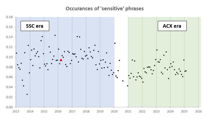 This is an imperfect measure because it only tracks if someone is using a sensitive phrase and not whether they are using it in a heretical way (cf. ‘fifty Stalins’ here). However, I thought in the context of ACX posts the approach was probably reasonable – sensitive phrases are only likely to appear if they are being discussed a lot, and we know from the previous section that discussion depth is high both now and during the 2016 peak engagement period. It isn’t necessarily true that deep discussion implies spirited debate - some political discussions on reddit can go into the thousands of comments without anyone ever actually expressing a counter-orthodoxy view – but I think in the specific context of ACX it is reasonable, because we don’t generally have norms of expressing substanceless agreement. Hopefully, therefore, the changing ratio of socially or professionally sensitive phrases to phrases not included in my dictionary would tell us something about the willingness of the comment section to engage in potentially emotive discussions at any point in time.