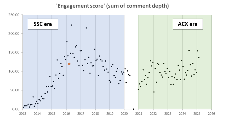 The average depth of a comment chain is actually highest now, in 2025. However, the proportion of comments with zero replies was lowest during 2016, and has been creeping up steadily since – meaning that the proportion of commentors who find themselves just screaming into the void with no response has increased since 2016. I don’t precisely know how to weight ‘discussions are good when they get going’ vs ‘discussions are easy to get going’, but we could try and capture some of the intuition here with a compound ‘engagement score’ (for example below I show the sum of all comment depth in a thread). Regardless of exactly how you operationalise it, it is reasonable to say 2016 was a strong period for depth of engagement, and that engagement markers have been trending upwards since the start of ACX, reversing a decline seen in the later SSC-period.
