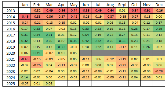The output of this scoring algorithm is recorded below. A score of zero means a perfectly average month, and positive scores indicate higher Commentariat Quality as defined by my algorithm. The cells are colour-coded so that stronger months are greener and weaker months are redder (grey cells are the blog’s hiatus, and don’t count towards the averages).