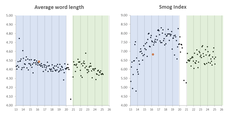 - Complexity of thought measures show clear directional reversals on every measure except average word length (which has been steadily declining) in both 2017 and 2021. This would be great confirmation for the theory that quality declined in 2016 except you’ll notice that 2017 is a bit too late to explain that!