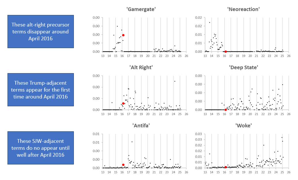 - Looking at the data for related terms makes it clear that a massive shift in discourse occurred around the time of Trump’s election – terms which were somewhat common before (like SJW) died out basically overnight, whereas terms which arose in the alt-right ecosystem spring up basically at the same time. Also of importance, there is no clear term that replaces ‘SJW’ until early 2017 (with ‘antifa’), and no equivalent term that sticks until ‘woke’ enters common parlance.